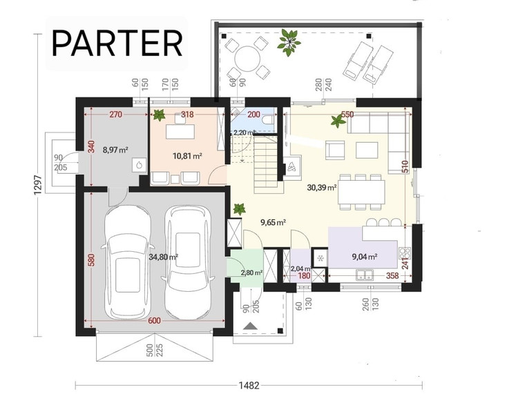 PARTER : salon z aneksem kuchennym, spiżarnia, mała toaleta, pokój ( gabinet ) , hol.
