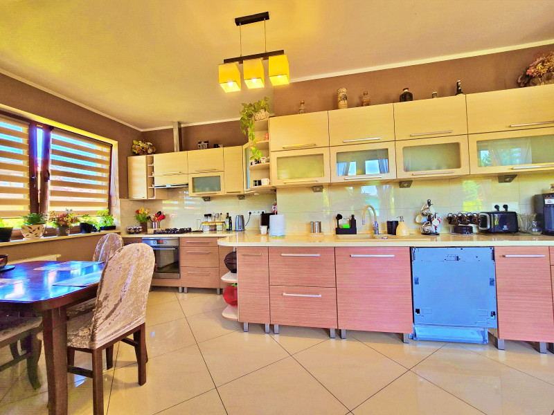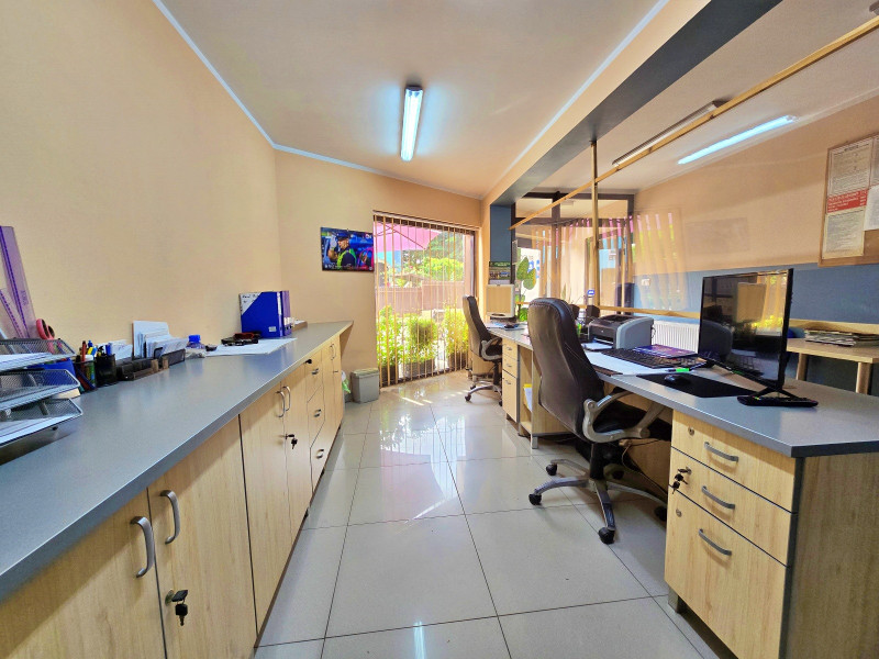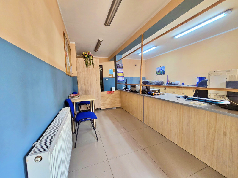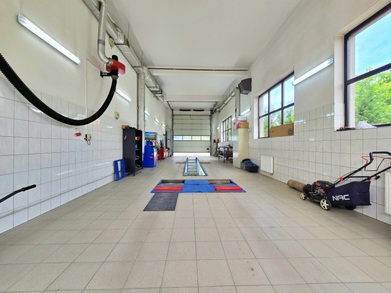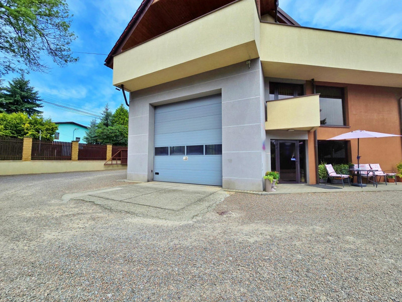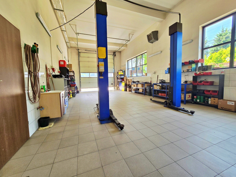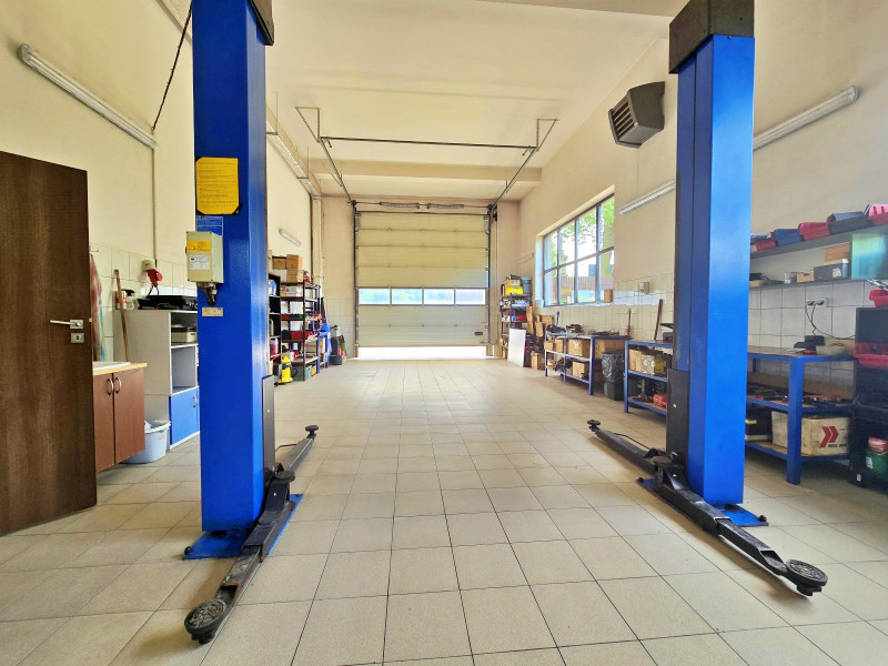 W części parterowej budynku znajdują się 2 hale: 1 -70 m2, 2 -100 m2 połączone przejściem , biuro , WC, pomieszczenie z piecem gazowym, pomieszczenie z piecem węglowym z podajnikiem na ekogroszek / pelet , pomieszczenie socjalne z WC. Hale wyposażone w elektrycznie podnoszone bramy. Na większej hali przy bramach kurtyny ciepłego powietrza. Część parterowa budynku wyposażona w stolarkę drzwi i okna aluminiowe z przyciemnionymi szybami. Budynek wyposażony w instalację wentylacyjną nawiewno- wywiewną mechaniczną. Budynek posiada instalację elektryczną przystosowaną do podpięcia zewnętrznego agregatu prądotwórczego. Oświetlenie wewnętrzne LED. Osobny licznik prądu dla części usługowej i osobny dla części mieszkalnej. Na większej hali kanał z wentylacją mechaniczną nawiewno -wywiewną. Na obydwu halach nagrzewnice nadmuchowe, oraz kaloryfery we wszystkich pomieszczeniach.