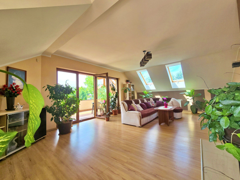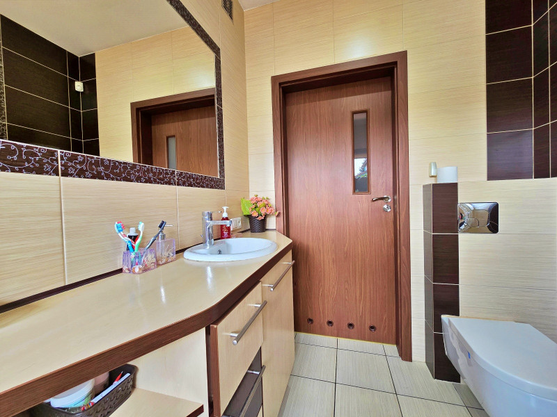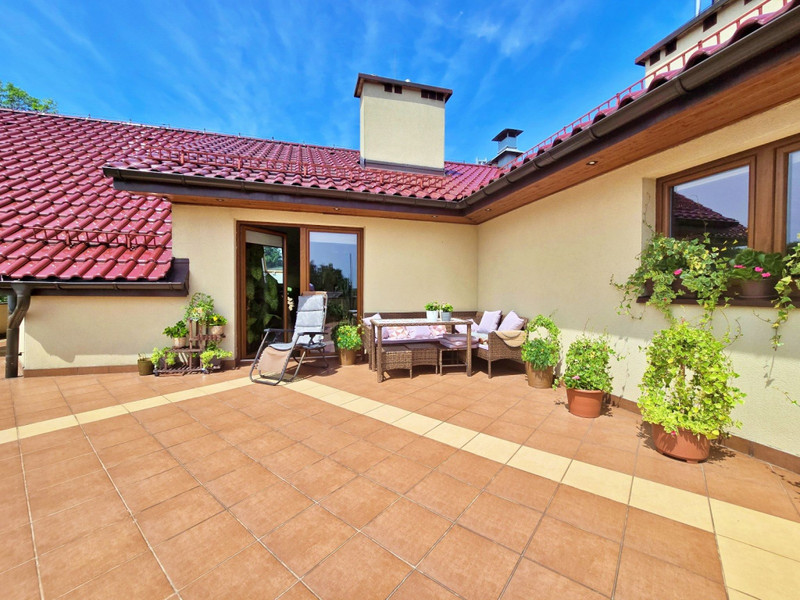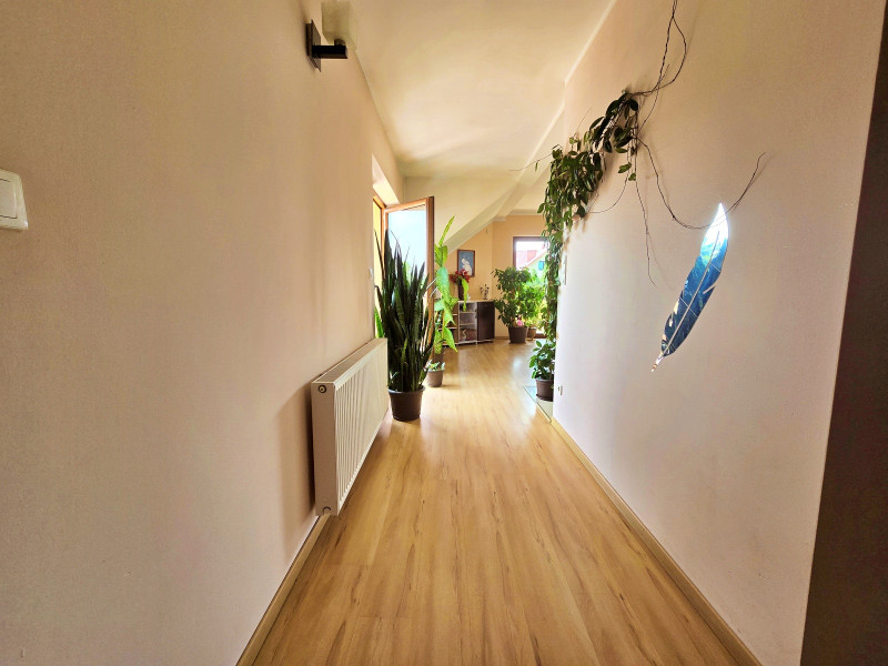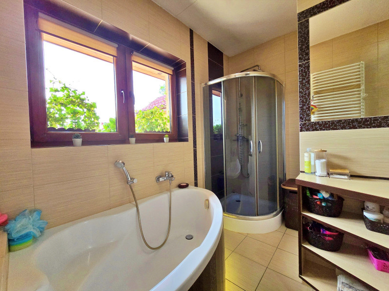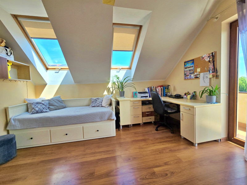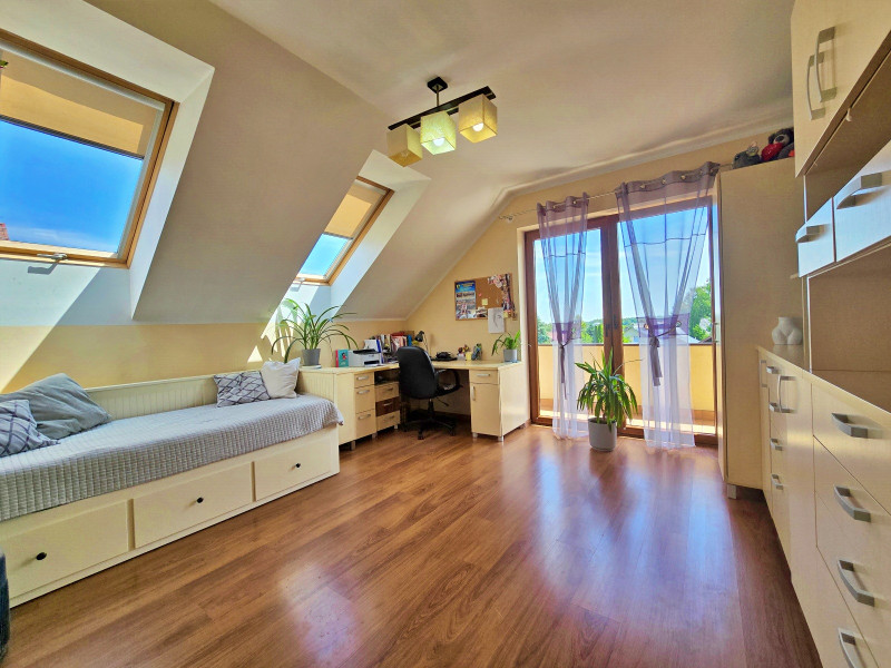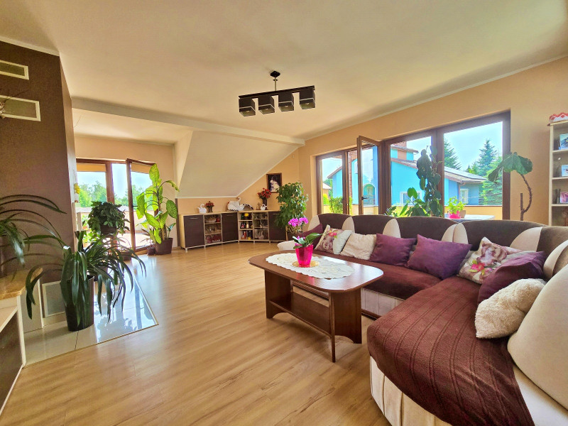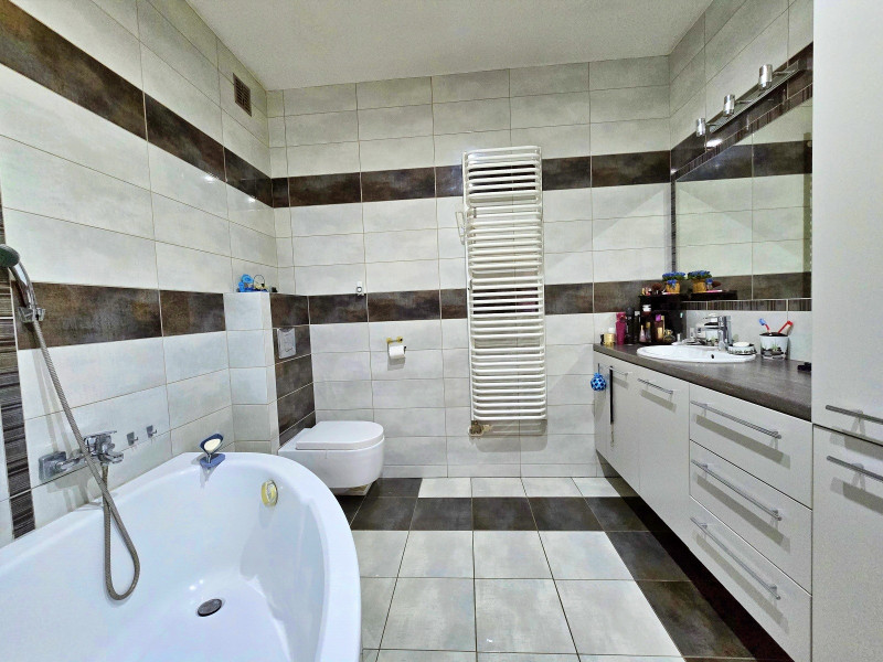 Dalej jest jedna duża sypialnia z łazienką, WC, wanna, następnie pokój, dalej druga łazienka z wanną , kabiną prysznicową i WC z oknem na taras, następnie dwa pokoje z wyjściem na duży balkon.