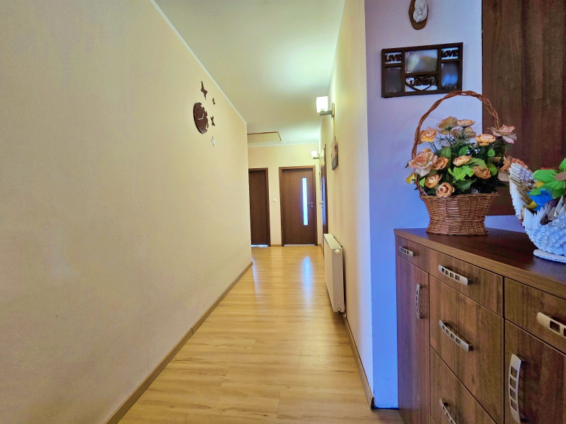 Duży hol z którego jest wejście do WC , przejście do dużego salonu posiadającego dwa wyjścia na duży taras , którego część jest zadaszona.
