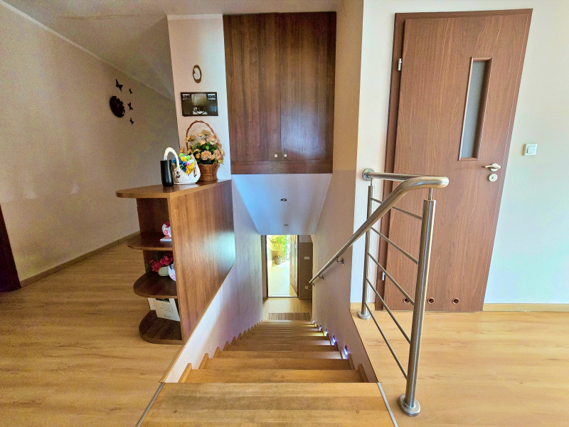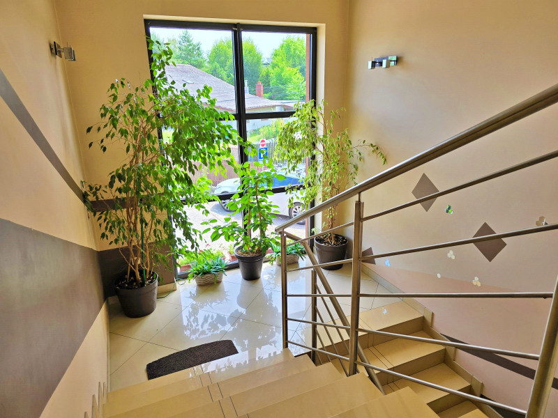 Wejście do części mieszkalnej jest dużą i wygodną klatką schodową i jest osobnym, niezależnym wejściem, można również dostać się do części mieszkalnej wchodząc wejściem dla części usługowej.