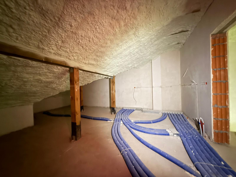 W całym budynku została wykonana wylewka anhydrytowa dedykowana do ogrzewania podłogowego, które zostało wykonane na parterze i 1 piętrze (w tym w garażu).
