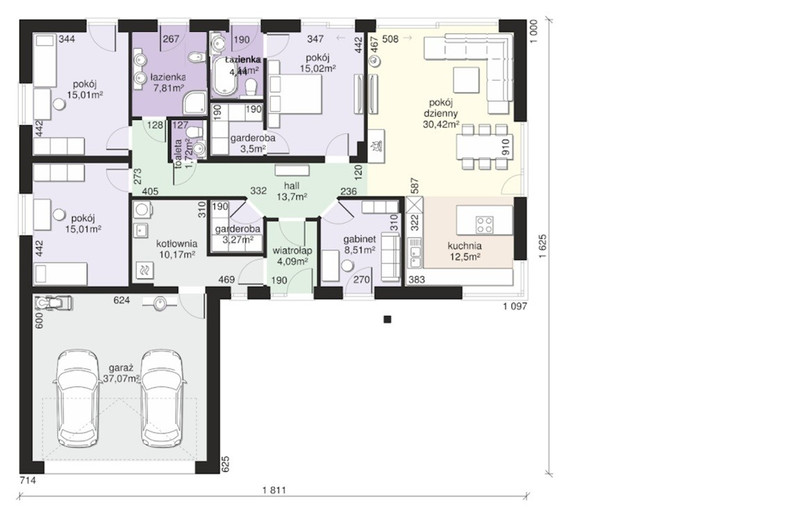 • Garaż: Dwustanowiskowy w bryle budynku (ok. 37 m²), z bramą na pilota.