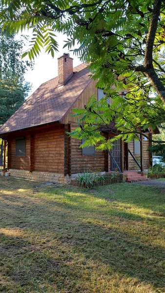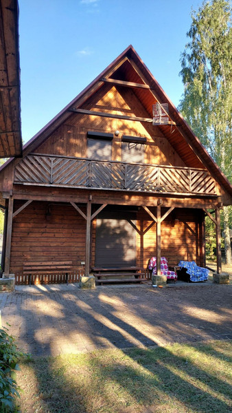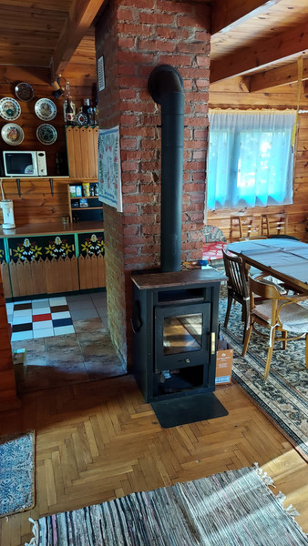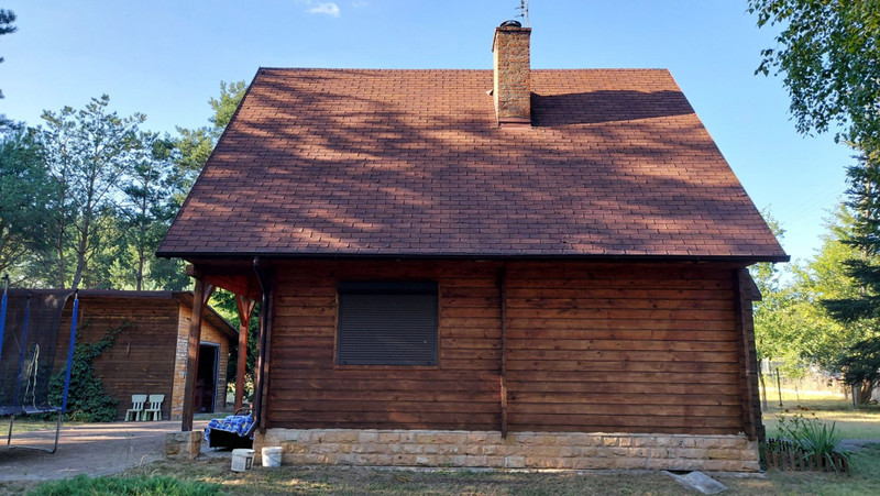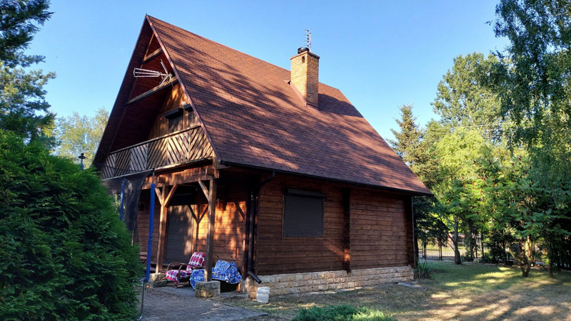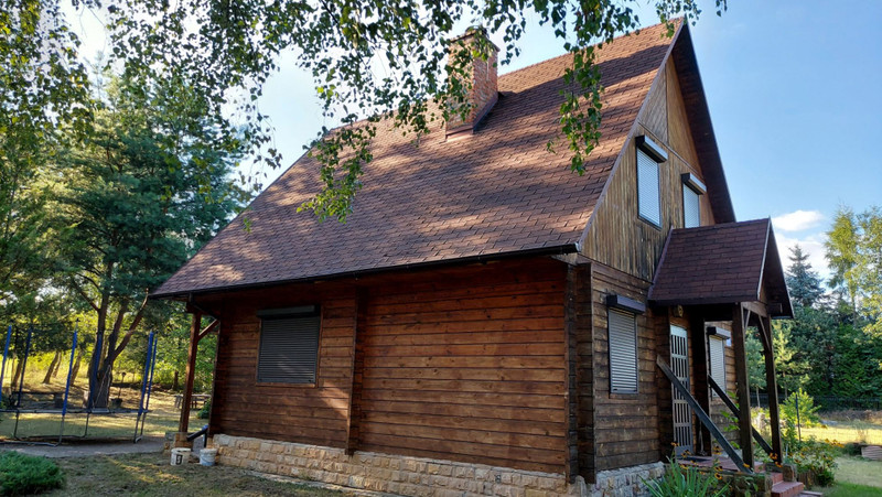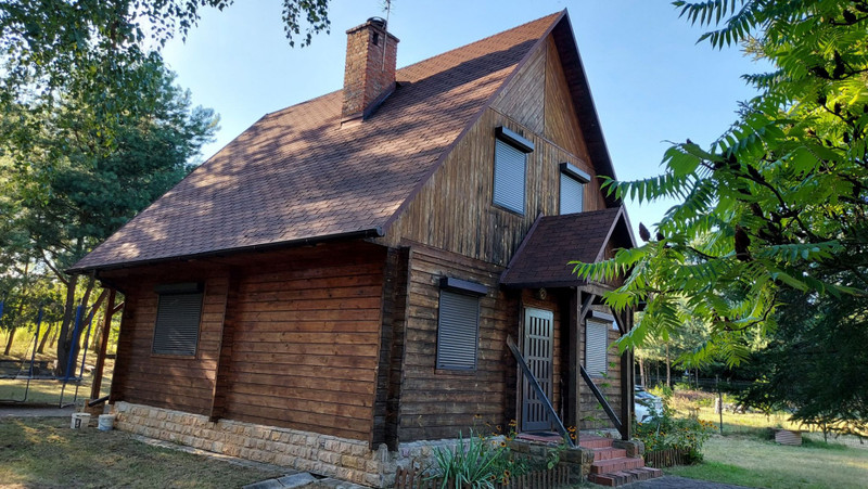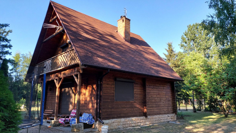 Dom wybudowany w 2002 roku, z pół bali drewna świerkowego, z dachem pokrytym gontem bitumicznym. Posiada drewniane okna, zabezpieczone żaluzjami antywłamaniowymi oraz grube solidne drewniane drzwi antywłamaniowe. Instalacja elektryczna 230/400 V. Ogrzewanie kominkowe i elektryczne podłogowe na dolnej kondygnacji, a góra ogrzewana jest poprzez grzejniki przenośne. W salonie na podłodze położony parkiet dębowy. Do podgrzewania wody zamontowano przepływowe ogrzewacze wody, jeden w łazience, a drugi w kuchni.