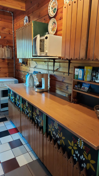 • kuchnia w pełni wyposażona: zmywarka, zlewozmywak, kuchnia elektryczna z piekarnikiem, lodówka, mikrofala, czajnik elektryczny, ekspres do kawy oraz meble kuchenne z cepelii,
