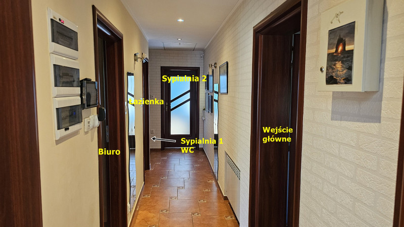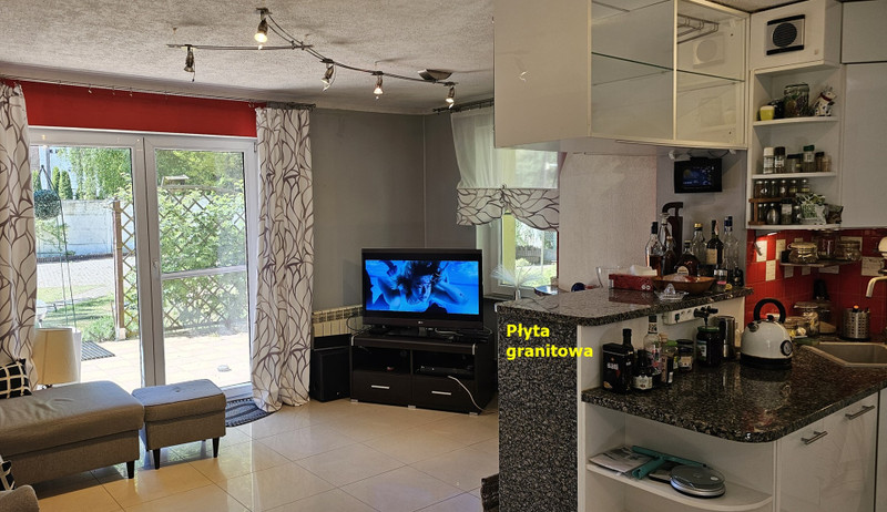 Na parterze domu jest salon z kuchnią (ok. 35 m.kw.), na podłodze jasna glazura; obok schowanko z samoczynna wentylacją o wym. 3x2 m; następnie korytarz, który prowadzi do pierwszego pokoju 3 x 4 m urządzonego na biuro i centrum sterujące CO, następnie do łazienki z wybudowaną kabiną prysznicową i wanną z Jakuzzi wodnym i powietrznym, glazura jasna zielona oraz bidet; następnie jest odrębne WC; i dwie sypialnie o pow. ok. 4x3,5 m.kw z panelami na podłodze. We wszystkich oknach uchylnych są moskitiery.