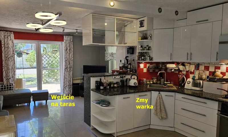 c) Urządzenia w salonie to podwójna duża lodówka-zamrażarka SAMSUNG z kostkarką i filtrowaną schłodzoną wodą oraz zmywarka BOSCH (7 letnia);
