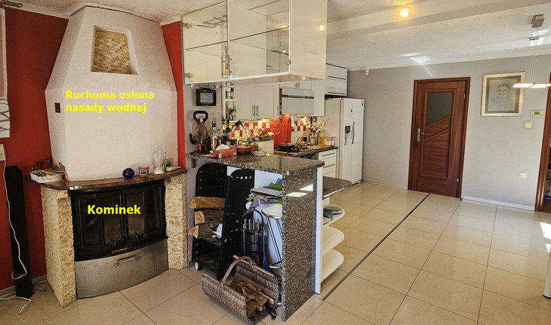 System ogrzewania całego domu (z górą włącznie) jest przy pomocy pieca gazowego VAILLANT i kominka z nasadą wodną włączone w instalację CO. Kominek produkcji Norweskiej marki JOTUL (30KW) z automatycznym sterowaniem przepustnicą powietrza pobieranym z zewnątrz (w zależności od temperatury) z harmonijkowymi drzwiczkami (mieści kłody drewna 0,8 m) i ogrzewa cały dom w tym ogrzewanie podłogowe.