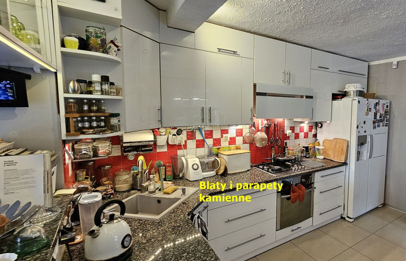 b) w salonie, kuchni blaty są wykonane z przyciemnionych grubych polerowanych płyt granitowych a także parapety,