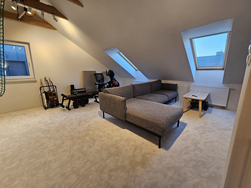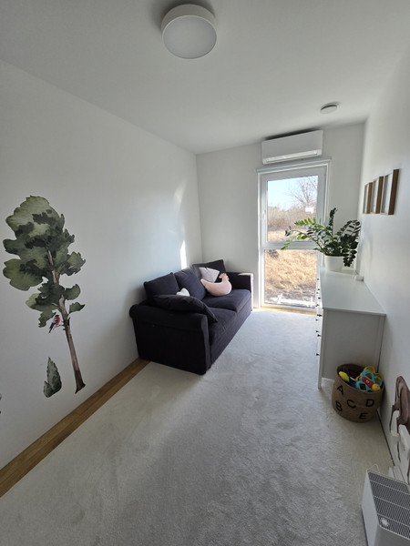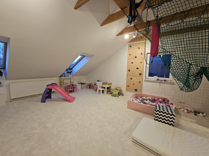 • Poddasze: jedno pomieszczenie długości 11m i szerokości 6m, 4,5m wysokości w najwyższym miejscu, 4 okna dachowe i dwa okna w ścianie pionowej dają wyjątkowo dużo światła. Obecnie bawialnia dla dzieci z miękką wykładziną(z dodatkowym miękkim podkładem), mini siłownią i TV. W razie potrzeby można zrobić tutaj 2-3 dodatkowe pokoje i łazienkę.