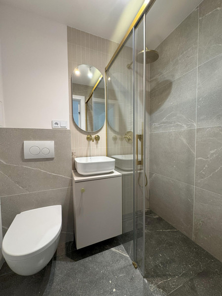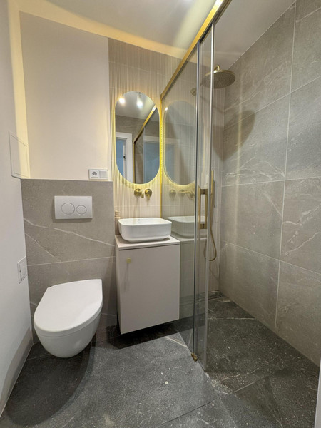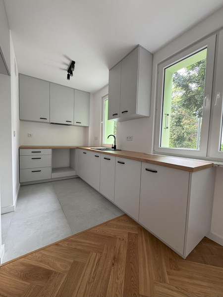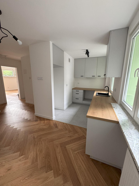 W całym mieszkaniu położona została nowa drewniana podłoga ułożona w klasyczną jodełkę, wymieniono wszystkie instalacje oraz stolarkę okienną. Kuchnia została wykonana na zamówienie — zabudowa w pełni dopasowana do przestrzeni, z wykończeniem płytkami Maxfliz (również w części korytarza). Łazienka została wykończona w całości płytkami Cermag i wyposażona w wysokiej klasy armaturę: kabina Radaway, zestaw podtynkowy Geberit oraz baterie i wylewka Omnires. W salonie i sypialni zamontowane są rolety antywłamaniowe, które przeszły przegląd z wymianą części listw oraz systemów podciągających.