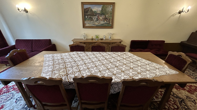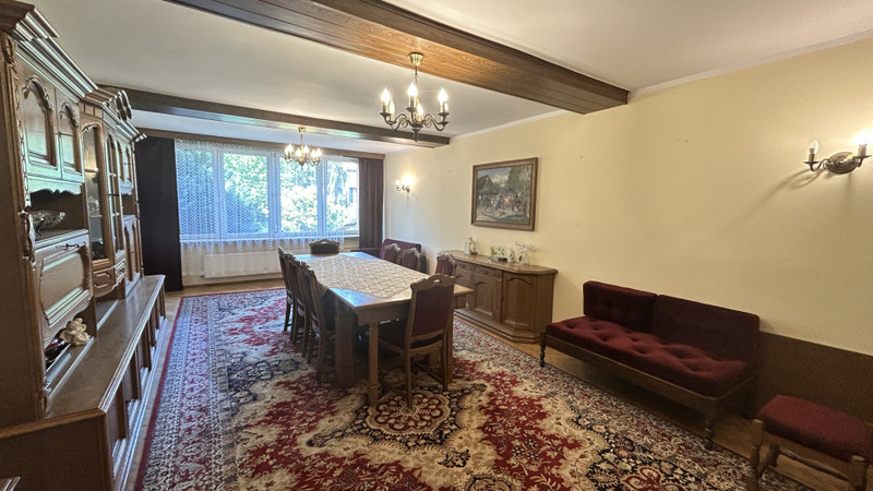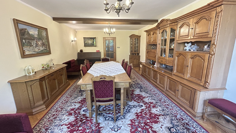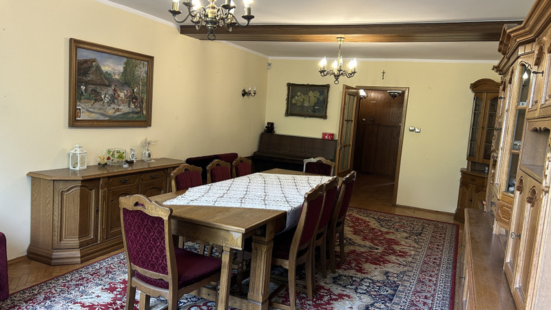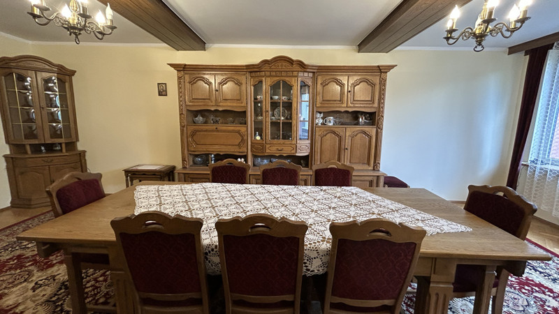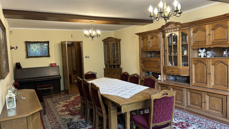 Dom jest kompletnie wyposażony i nadaje się do natychmiastowego zamieszkania. Odświeżenia (przemalowania) wymagają jedynie ściany w pokojach oraz klepka dębowa wymaga miejscami cyklinowania. Prawie całe umeblowanie i wyposażenie widoczne na zdjęciach pozostanie dla kupującego. W skład tego wyposażenia wchodzą m.in. meble dębowe w dużym pokoju, meble drewniane w pozostałych pomieszczeniach, piekarnik, piecyk gazowy, zmywarka i lodówka w kuchni, dywany w części pomieszczeń, pianino Calisia, telewizor. Elewacja domu była niedawno odnawiana i jest w bardzo dobrym stanie.