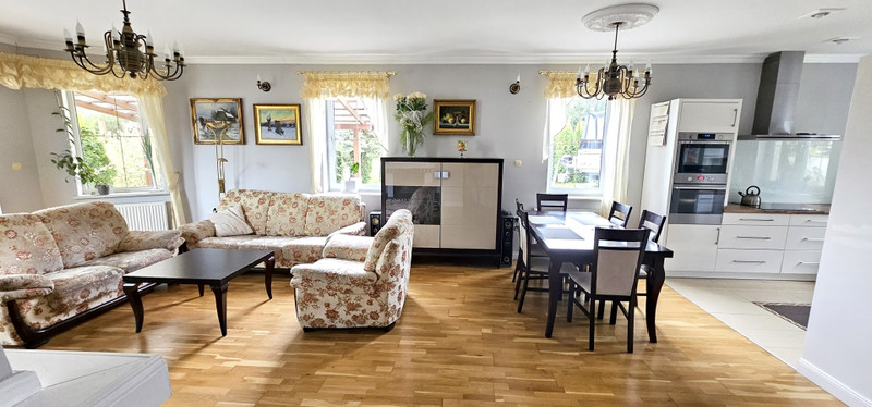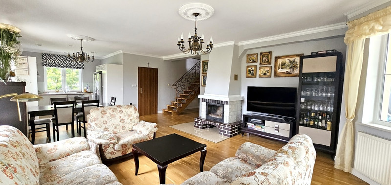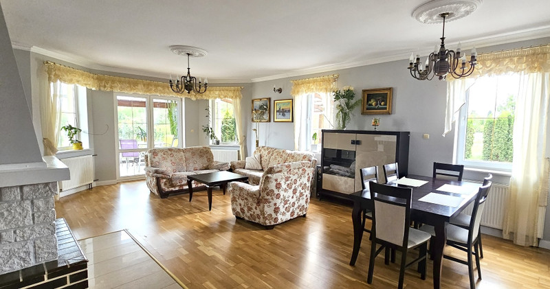 Nowoczesny dom położony na dużej zagospodarowanej działce w otulinie parku krajobrazowego. Dogodne położenie (lasy , jeziora , trasa S7). W skład posiadłości wchodzą : -