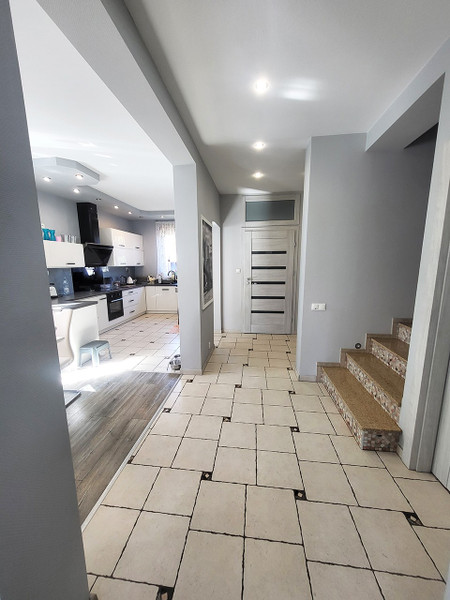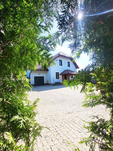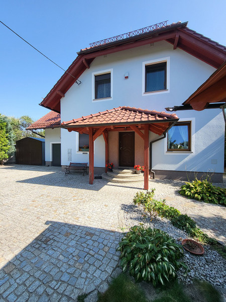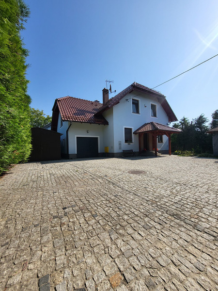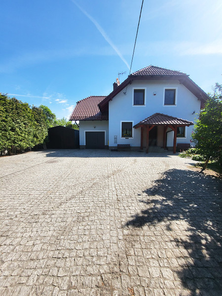Działka o pow. 996 m2. Główną bryłę tworzą dwa prostopadłościany przykryte dachami dwuspadowymi zestawione prostopadle względem siebie w kształcie litery T. Dom wykonany z pustaka ceramicznego Wenerberger, ocieplony wełną gr. 20 cm. Dach pokryty dachówką ceramiczną. Okna firmy Velux – stolarka okienna plastikowa w kolorze dąb rustykalny z obu stron wzmacniane przeciw włamaniu z szybami pancernymi o klasie bezpieczeństwa P4. Dodatkowo na parterze rolety zewnętrzne antywłamaniowe sterowane elektrycznie. Instalacja alarmowa i monitoring (6 kamer). Teren całej posesji ogrodzony solidnym murem na wys. 2 m w większości zasłonięty zadbanymi tujami.