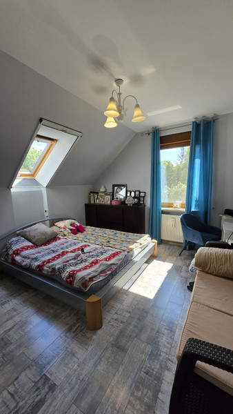 Dom o powierzchni użytkowej 150,62 m2. W bryle garaż 1 stanowiskowy (o pow. 21 m2 dodatkowo) z bramą uchylną sterowną elektrycznie. Obok domu dodatkowy garaż blaszany 1 stanowiskowy.