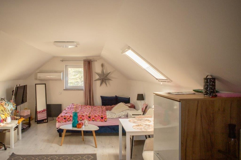 Na terenie posesji znajduje się również murowany domek, który składa się z dwóch poziomów . Na parterze znajdują się dwa pomieszczenia oraz łazienka z prysznicem a na piętrze przestronny pokój z klimatyzacją i aneksem kuchennym. Domek jest ogrzewany elektrycznie ale instalacja fotowoltaiczna sprawia, że jest to rozwiązanie ekonomiczne i ekologiczne. Obecnie na parterze mieści się salon groomerski ale jest to idealne miejsce do prowadzenia także innej działalności (salon fryzjerski, kosmetyczny itp.) lub pełnić funkcję domku dla gości.