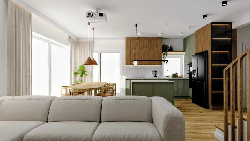 - ogrzewanie podłogowe w całym budynku (również w garażu), możliwość zdalnego sterowania temperaturą w każdym pomieszczeniu za pomocą smartfona