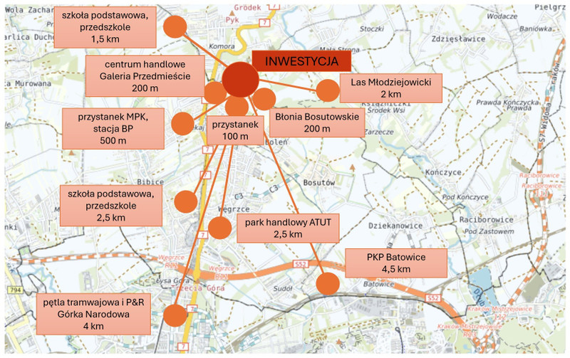 - do pętli tramwajowej i P&R Górka Narodowa 4 km (m. in. linie tramwajowe nr 18, 50, 69)
