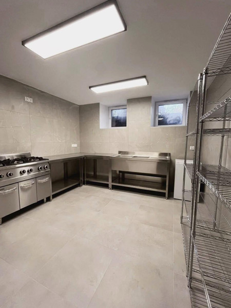 1. Umeblowana kuchnia z urządzeniami i blatami z stali nierdzewnej