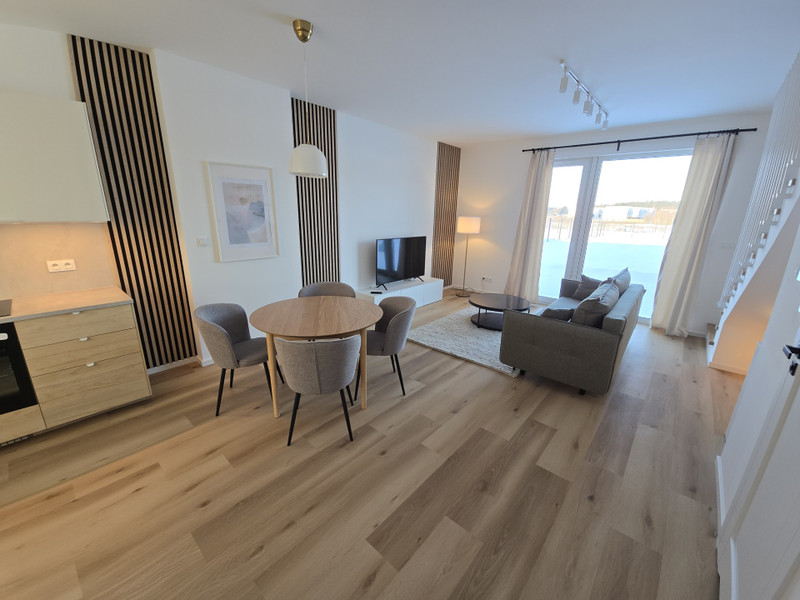 Do wynajęcia zupełnie nowy, wykończony, w pełni umeblowany, komfortowy, rodzinny dom z tarasem i ogrodem w zabudowie szeregowej na osiedlu Chojnów Park II w Krępie.
