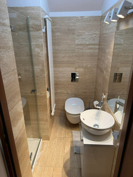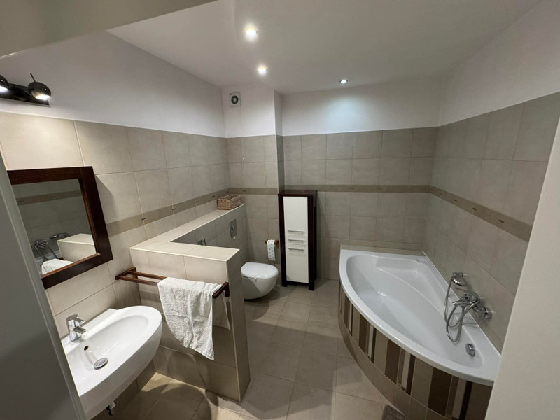 Lokalizacja oferuje ciszę, bliskość terenów zielonych i dobry dostęp do komunikacji — przystanek autobusowy oddalony jest o około 8 minut pieszo, a dojazd do metra zajmuje około 20 minut. Czynsz najmu wynosi 8900 zł, a miesięczne opłaty około 1000 zł.