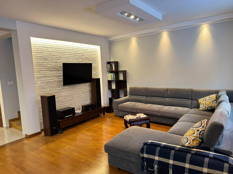 Do wynajęcia wygodny dom w zabudowie szeregowej na Bielanach (Radiowo, ul. Jowisza – boczna Arkuszowej), z garażem i kameralnym ogródkiem. Nieruchomość położona jest przy spokojnej, ślepej ulicy niedaleko lasu. Dom ma ok. 175 m² powierzchni użytkowej i został wybudowany w 2000 roku. Składa się z czterech oddzielnych pokoi, trzech łazienek, przestronnego salonu z jadalnią, kuchni oraz nieużytkowego poddasza wykorzystywanego jako miejsce do przechowywania rzeczy i pralnia. Na parterze znajduje się duża strefa dzienna z kuchnią, dodatkowy pokój i łazienka, a na pierwszym piętrze trzy sypialnie, dwie łazienki i dwie garderoby. Garaż w bryle budynku oraz miejsce postojowe przed domem zapewniają wygodne parkowanie. Dom ogrzewany jest nowoczesnym piecem gazowym.