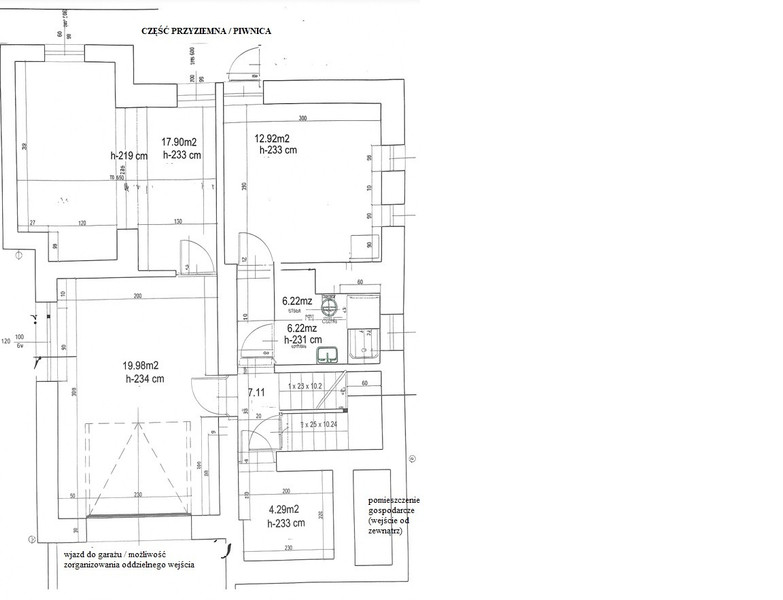 • dom: 2 kondygnacje (2.6 m wysokości) + część przyziemna (piwnica z oknami, pomieszczenia o wysokości 2.33 m) + użytkowe poddasze; łącznie 6 łazienek; na każdej kondygnacji możliwość zaaranżowania kuchni