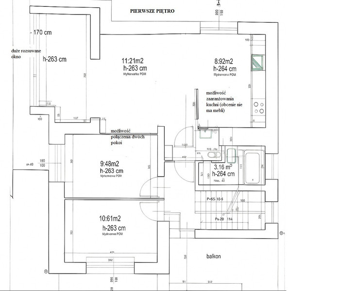 • pierwsze piętro: 4 pokoje, 2 łazienki, balkon