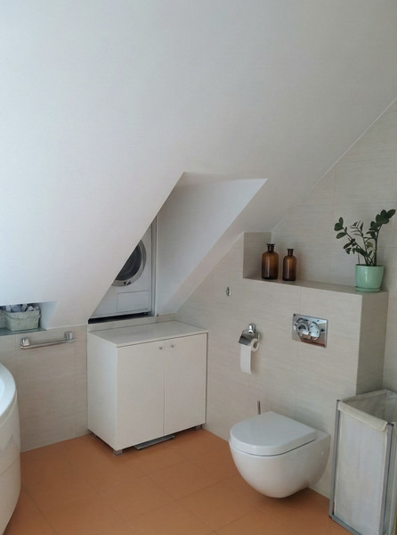 Łazienka SPA: Jasna, doświetlona oknem dachowym, wyposażona w prysznic, wannę z hydromasażem oraz pralkę i suszarkę marki Bosch.