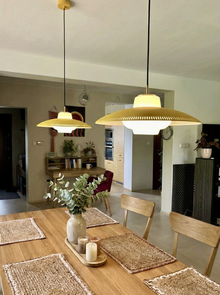 Jadalnia: Serce domu z solidnym, dębowym stołem i krzesłami dla 6 osób, oświetlona designerskimi lampami.