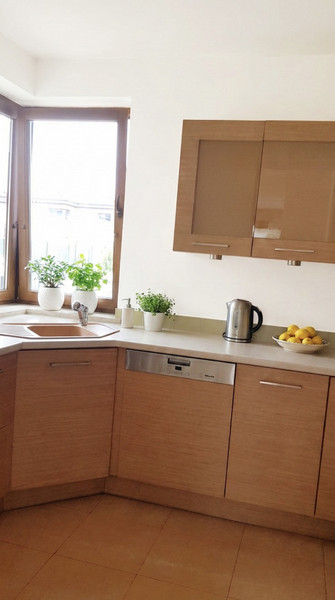 Wysoka jakość: Meble dębowe, ceramika Villeroy & Boch, sprzęt AGD marek Miele, Bosch, Teka, designerskie oświetlenie.