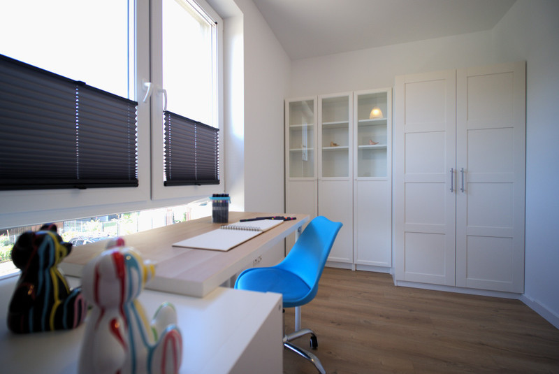 Pokój (11m2) z regałem, szafę oraz biurko.