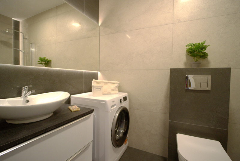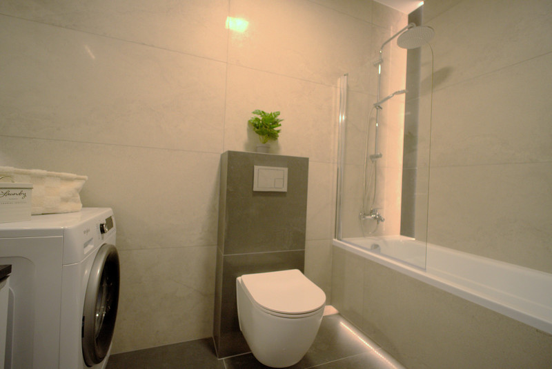 Łazienka wyposażona w pralkę oraz wannę z możliwością wzięcia prysznica.