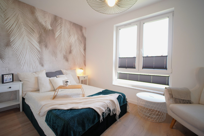 Sypialnia główna (13m2) wyposażona w duże dwuosobowe łóżko, fotel oraz pojemne szafy.