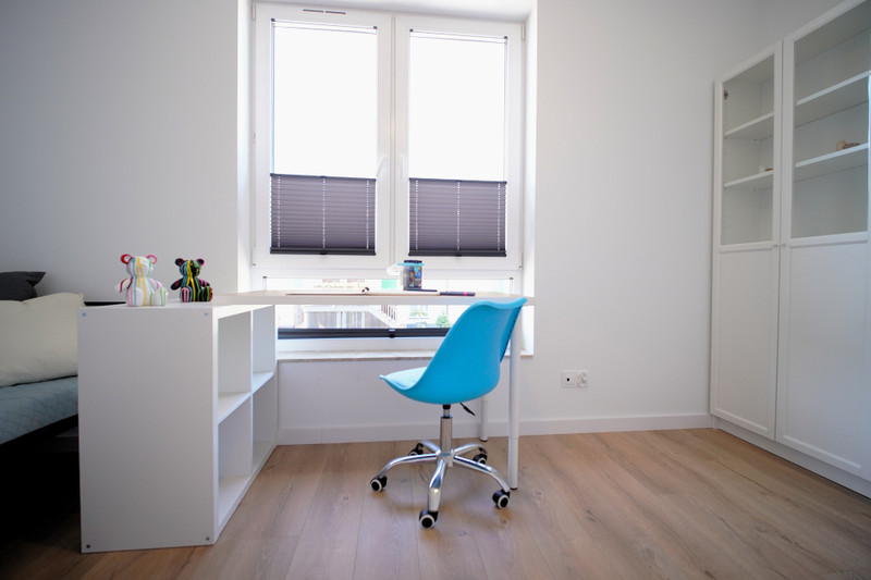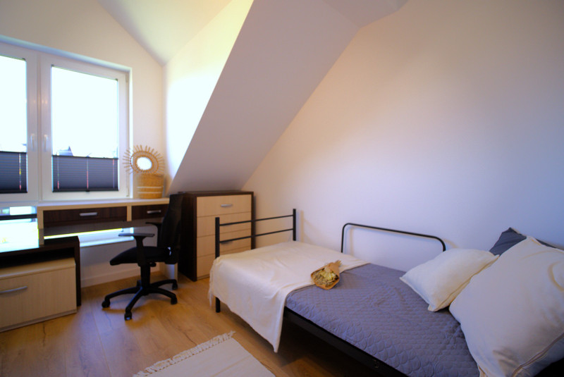 Pokój (12m2) wyposażony w pojedyncze łóżko, biurko oraz zestaw szafek.