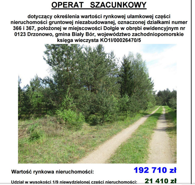 Udział wynoszący 1/9 niewydzielonej części w prawie własności nieruchomości gruntowej niezabudowanej oznaczonej działkami numer 366 i 367 (o łącznej powierzchni: 0,2069 ha), położonej w miejscowości Dołgie w obrębie ewidencyjnym nr 0123 Drzonowo, gmina Biały Bór, województwo zachodniopomorskie.