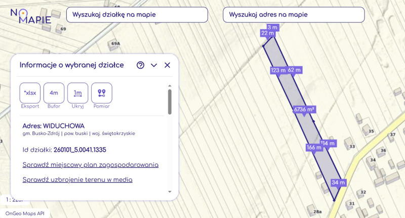 (wymiary: szerokość: 34m od drogi, 25m na końcu, długość ok. 280m)