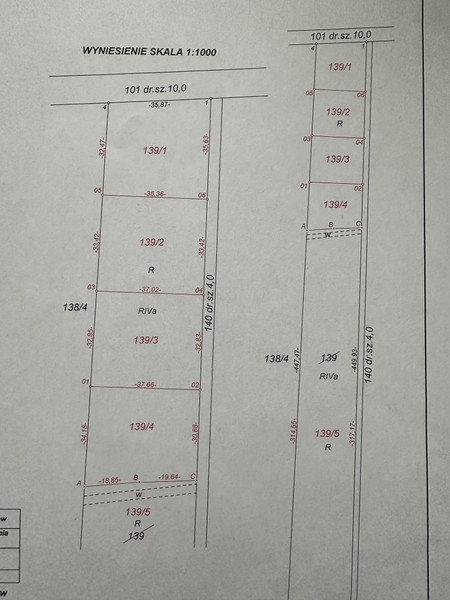 Działki nr 139/3 (1.200 m2), 139/6, 139/7, 139/8 (każda po 1.300 m2) jak na zdjęciach. Działki 139/1, 139/2, 139/4 są już niedostępne. Działki na planie kwadratu. Doprowadzone media do głównej drogi zlokalizowanej przy pobliskiej drodze powiatowej, woda wzdłuż działek. Droga gminna gruntowa prostopadła do asfaltowej (powiatowej) - z niej dostęp do działek, jak na zdjęciach/szkicach.