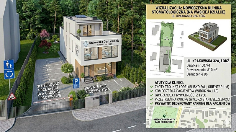 Potencjał inwestycyjny – Idealna pod Klinikę Medyczną / Stomatologiczną: Specyficzny, nowoczesny kształt działki pozwala na realizację projektu typu „Slim House” – wielokondygnacyjnego budynku o minimalistycznej architekturze z dużymi przeszkleniami.