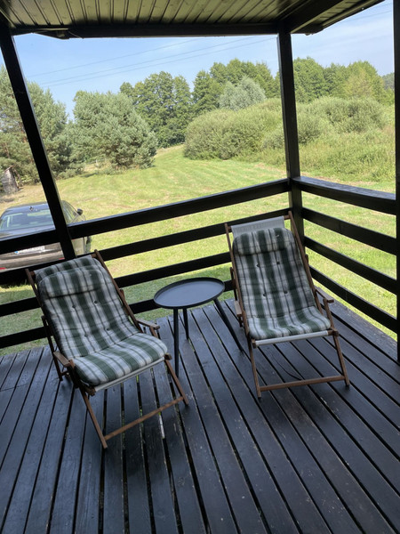 Dom otoczony jest z dwóch stron dużymi, zadaszonymi tarasami z widokiem na jezioro WARASZ.