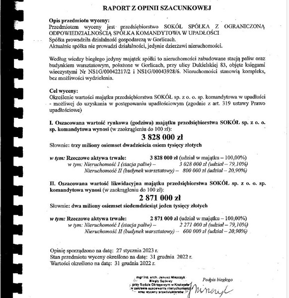 Syndyk Sokół sp. z o. o. sp. k. sprzeda nieruchomość zabudowaną położoną przy ul. Dukielskiej w Gorlicach: nieruchomość -dz. ew. nr 365/44, 366/5, 365/87, 365/86, wraz z odrębnym prawem własności budynków i urządzeń, objętą księgą wieczystą prowadzoną przez Sąd Rejonowy w Gorlicach, V Wydział Ksiąg Wieczystych o nr NS1G/00042217/2, o łącznej powierzchni 1698 m2, na której posadowiona jest stacja paliw - cena wywoławcza1532925