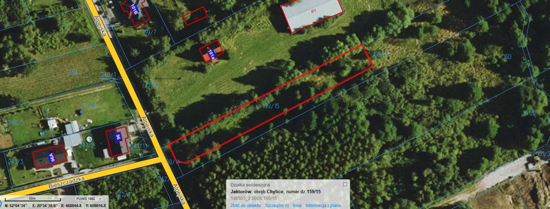 Sprzedam bezpośrednio świetnie położoną nieruchomość 28 km od granicy Warszawy, Gmina Jaktorów, miejscowość Chylice ul. Alpejska. Powierzchnia 4485 m2, prostokąt o wymiarach ok. 18,5 m x 250 m.