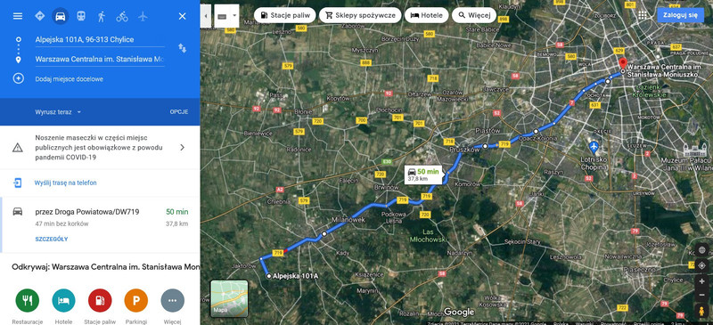 8 km do Drogi Ekspresowej S8 Trasa im. Bohaterów Bitwy Warszawskiej 1920