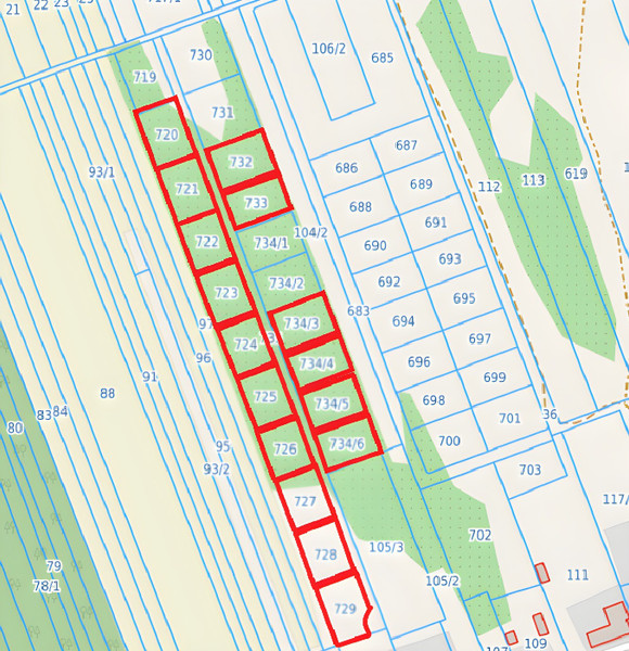 • nr 735 — 2519 m² - droga dojazdowa (każdy kupujący otrzymuję udział w drodze dojazdowej, służebność przejazdu do działek)