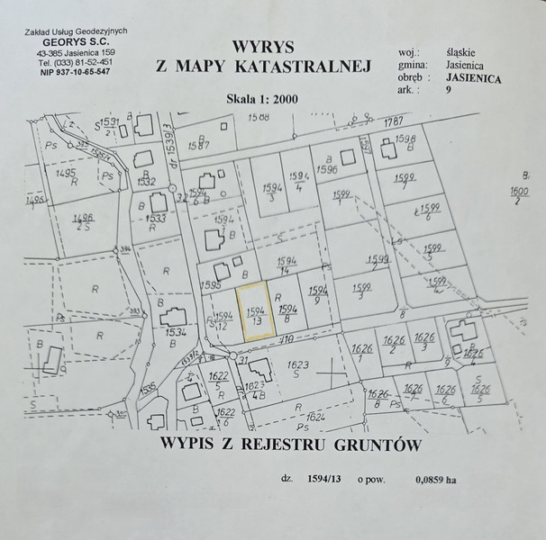 sprzedam działkę budowlaną nr 1594/13 w Jasienicy koło Bielska-Białej przy ul. Modrzewiowej o powierzchni 859 m2