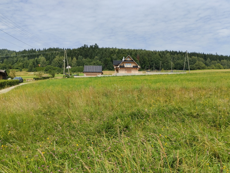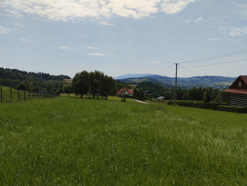 Widok na Babią górę i jej pasmo. Powyżej działki znajduje się las, możliwy dojazd do działki ze „starej S7” w miejscowości Krzeczów drogą lokalną.