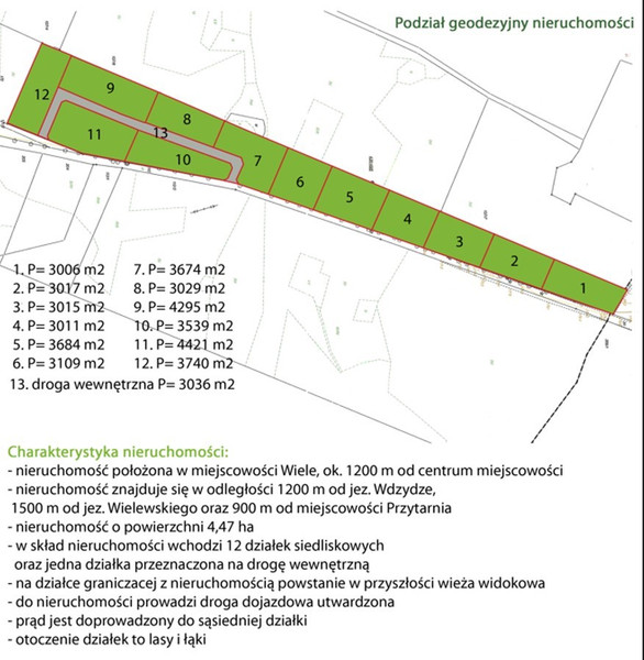 Mamy do zaproponowania nieruchomość położoną w miejscowości Wiele, w odległości 1200 m od jez. Wdzydze i 1500 m od jez. Wielewskiego. W skład nieruchomości o łącznej powierzchni 44,576 m2 wchodzi 12 działek siedliskowych oraz jedna działka przeznaczona na drogę wewnętrzną.