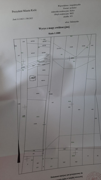 Na sprzedaż działka rolno-budowlana o pow. 5.005 m2, położona w Kielcach przy ul. Daleszyckiej, tuż obok Geoparku na Wietrzni, działka numer 431. Działka znajduje się w pierwszen linii zabudowy, od strony utwardzonej drogi o wym. 25x200m, w kształcie prostokąta, teren płaski, z pięknym widokiem na Telegraf. Cicha, spokojna, malownicza okolica. W pobliżu nowo powstające domy jednorodzinne. Media w drodze. Sprzedaż bez pośredników.