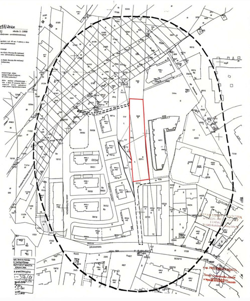 Sprzedam atrakcyjną działkę o powierzchni 2198 m2. - Działka zgodnie z planem zagospodarowania przestrzennego przeznaczona pod zabudowę wielorodzinną. Zlokalizowana jest na osiedlu Kraków Ruczaj, przy ulicy Drukarskiej. Działka otoczona budynkami od 5 do 10 pięter. W bezpośrednim sąsiedztwie działki znajduje się ciąg komunikacyjny, ulica Bobrzyńskiego wraz linią tramwajową, którą można dotrzeć w 20 minut do Centrum i na Dworzec Główny. Na przeciwko znajduje się Campus UJ. Do Zalewu Zakrzów i sklepu Kaufland pieszo jest ok.15 minut. Wszystkie media w sąsiedztwie działki. Dojazd drogą służebną wpisaną w księgę wieczystą. Działka w kształcie prostokąta, nieogrodzona. Na działce znajduje się ziemia pochodząca z wykopu pod sąsiednie bloki.