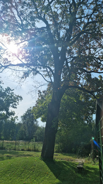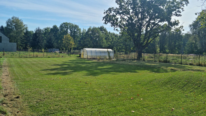 Działka jest ogrodzona siatką oraz znajdują się na niej : trawnik, szklarnia, automatyczna brama Wiśniowski, budka na narzędzia, furtka oraz duży klon.